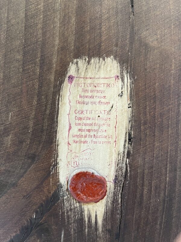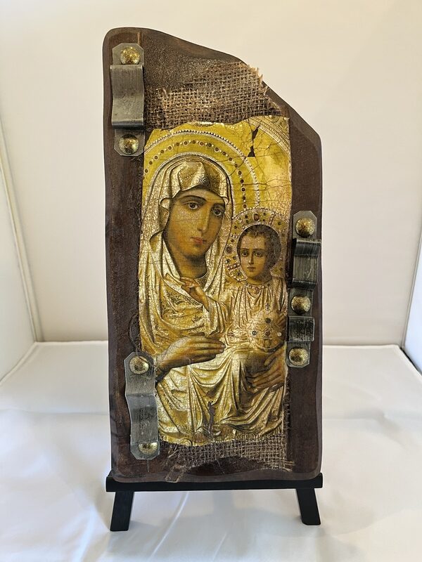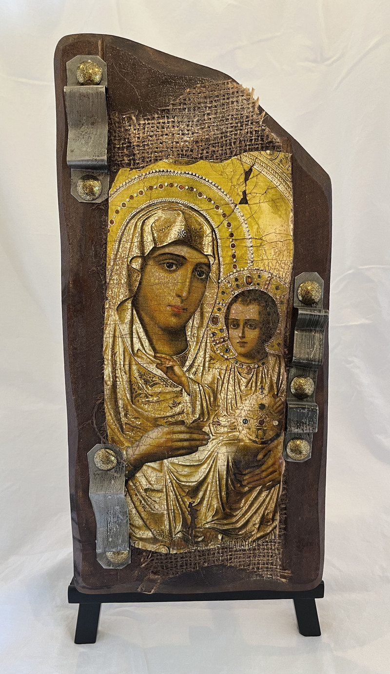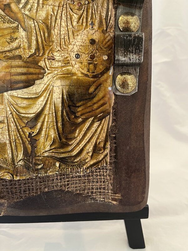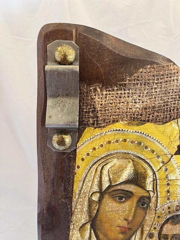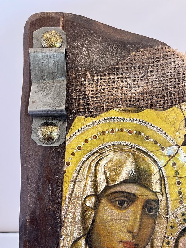 A stylized icon image produced with distressing techniques depicts a timeless image of Madonna with Christ child. Wax seal Certificate on back.