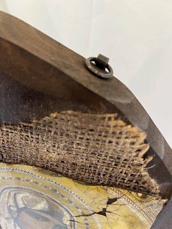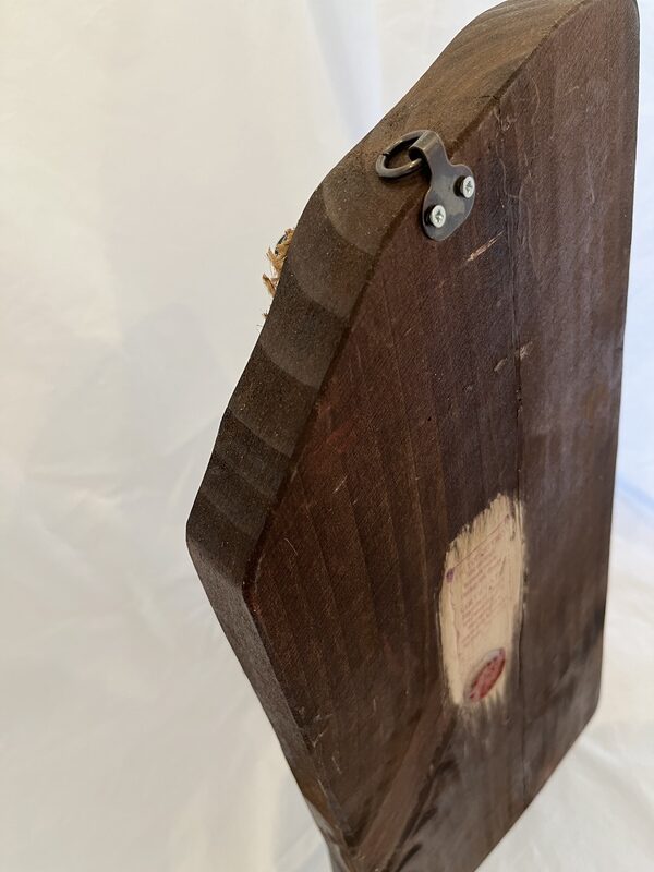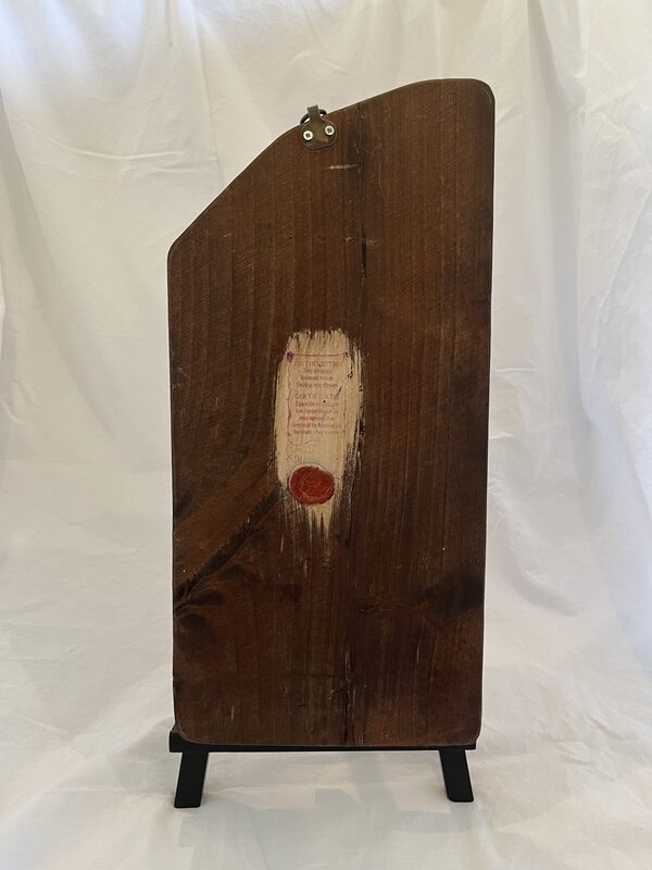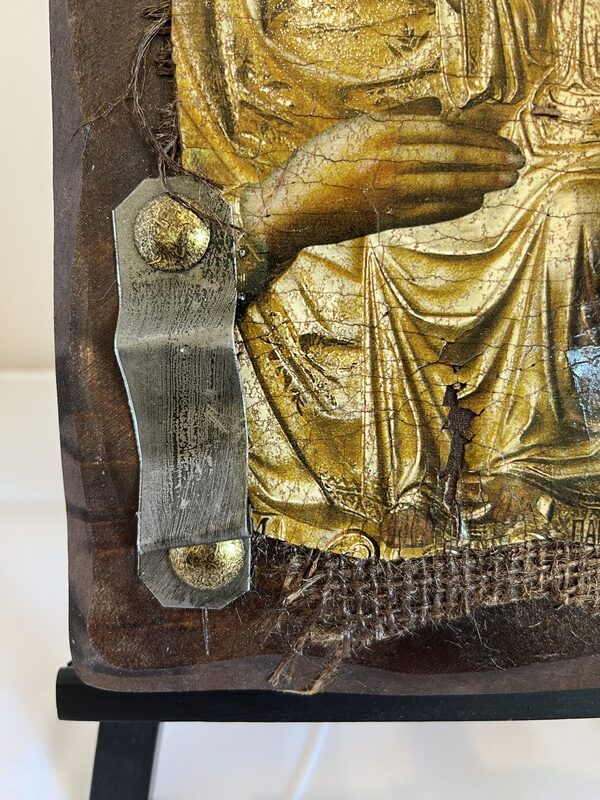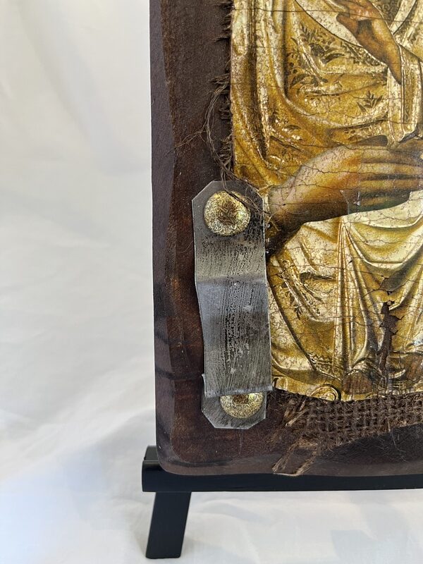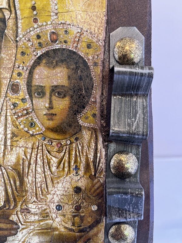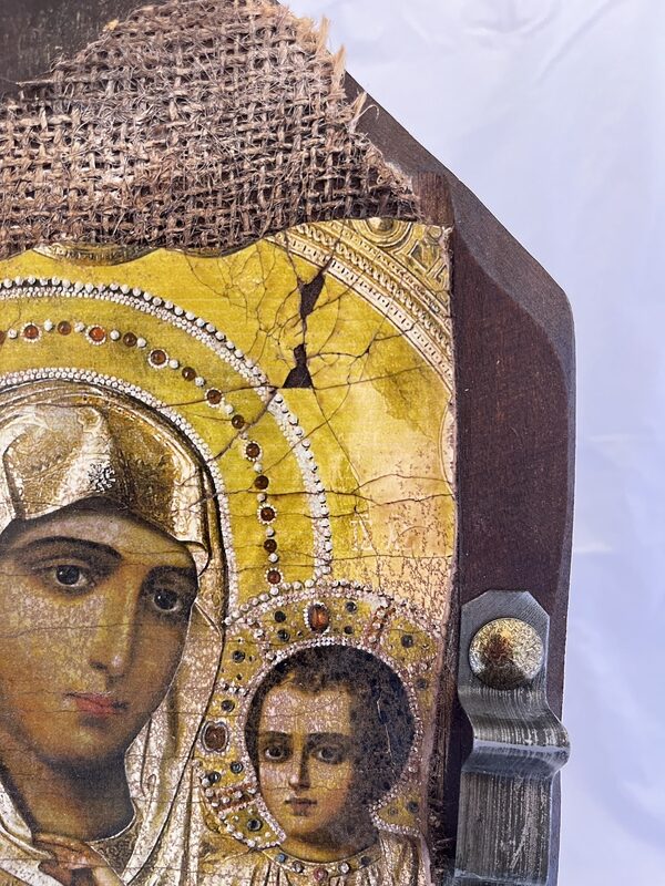 A stylized icon image produced with distressing techniques depicts a timeless image of Madonna with Christ child. Wax seal Certificate on back.
